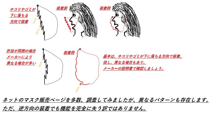 基本は、折目の中にホコリやゴミが蓄積しない方向での装着が正しいようです。